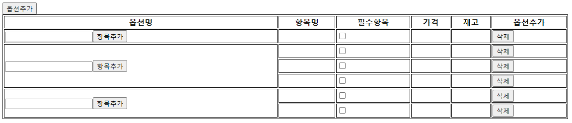 | 옵션명 | 항목명 | 필수항목 | 가격 | 재고 | 옵션추가 |